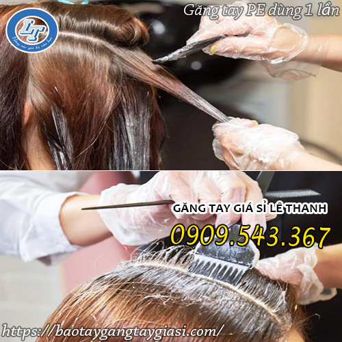 Ngoài ra, tại các hiệu tóc hiện nay, găng tay nilon là công cụ không thể thiếu mỗi khi tiếp xúc với các loại hóa chất, pha màu thuốc nhuộm tóc, thuốc uốn duỗi vừa thể hiện sự chuyên nghiệp riêng vừa có thể bảo vệ đôi tay không bị ăn mòn, thô ráp bởi hóa chất độc hại.